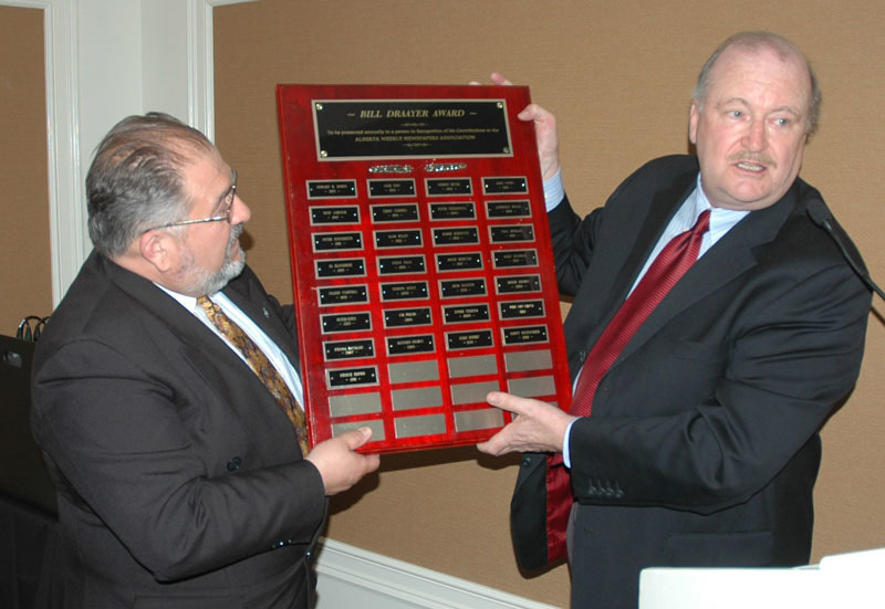 The Bill Draayer Award is presented to a weekly newspaper person for outstanding contribution to the progress and development of the Alberta Weekly Newspapers Association